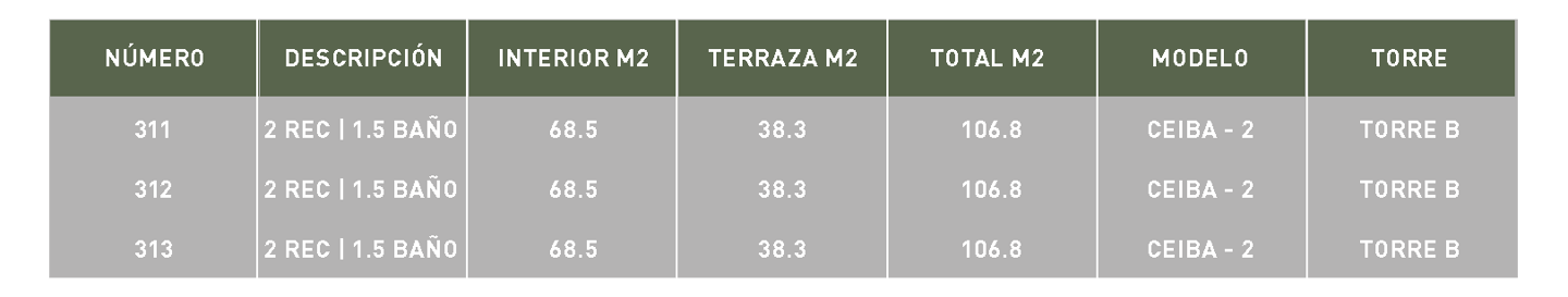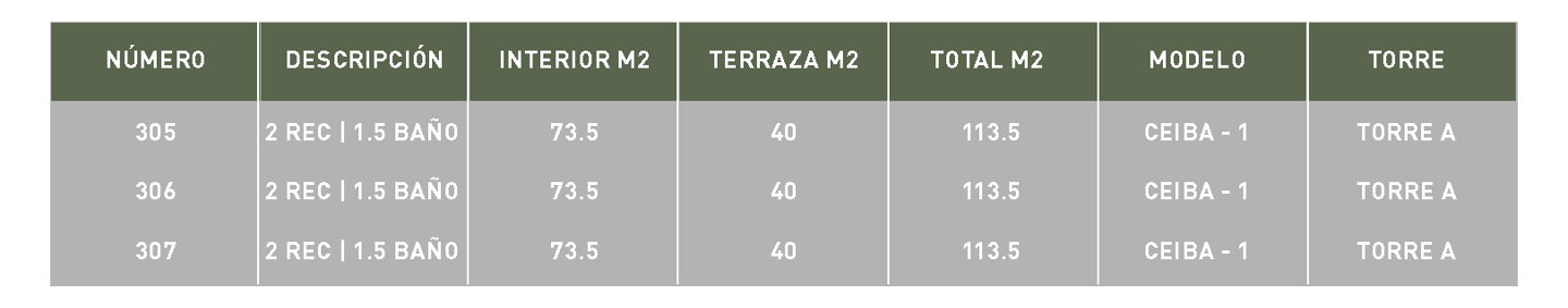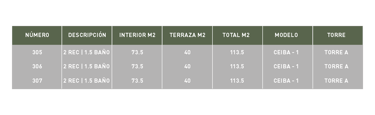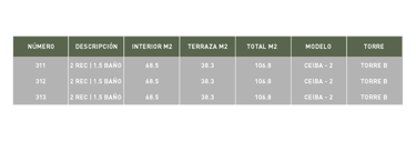 Recámara 1 | Balcón | Recámara 2 | Terraza | Baño completo | Área de trabajo