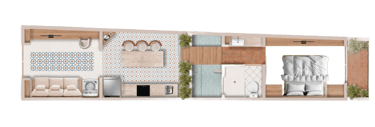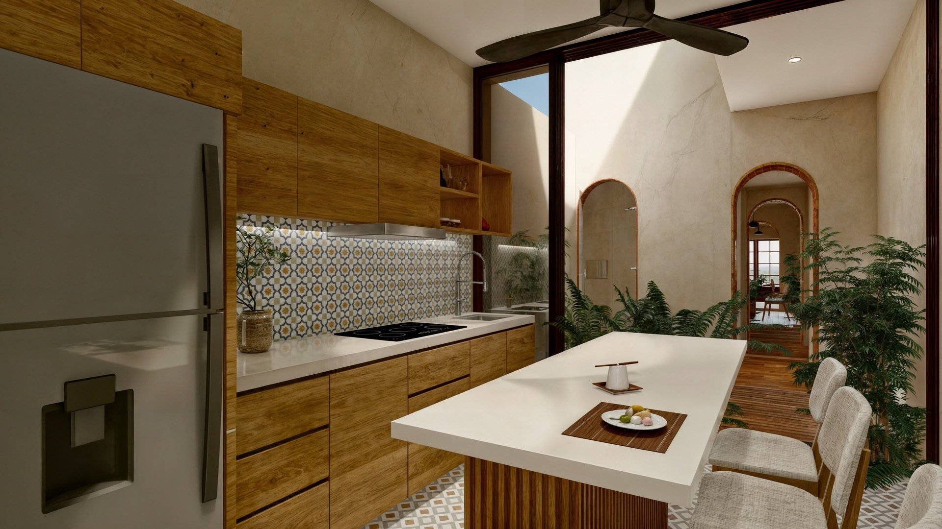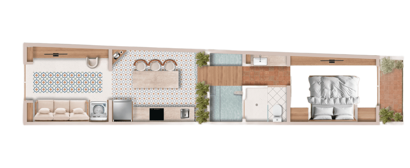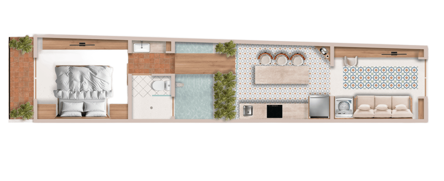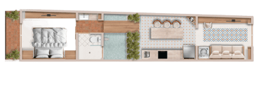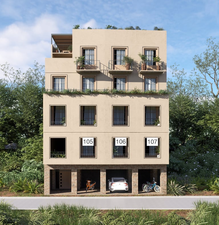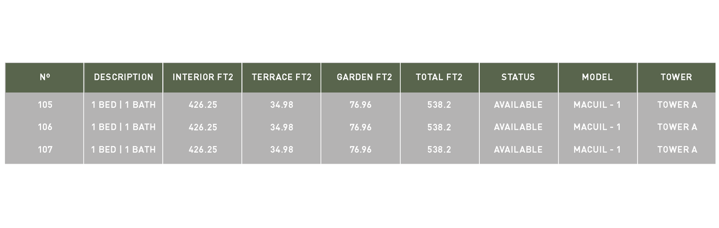 With six condominiums, Macuil offers more spacious and functional spaces that prioritize comfort. Each unit has a bedroom, a full bathroom, a garden with a private pool, and a terrace. Its design stands out for separating the kitchen/dining room from the living room, providing an independent atmosphere for each area and improving the organization and privacy of the spaces. All bedrooms reflect the same inspiration, with timeless interior design that combines natural elements and warm textures to create a cozy and harmonious space.