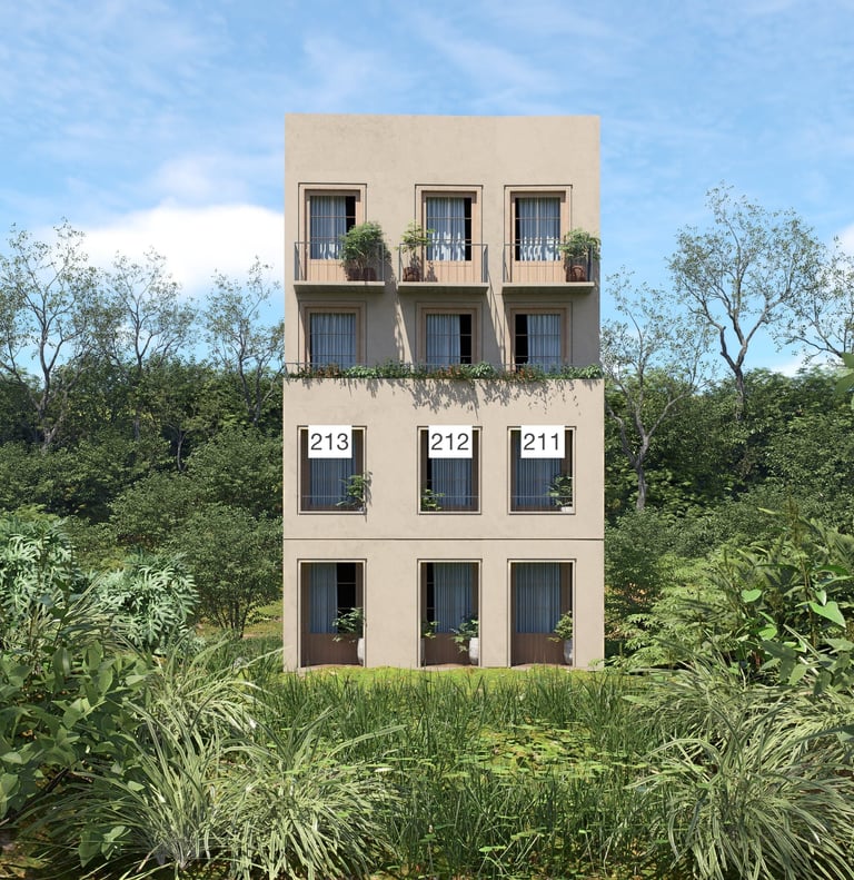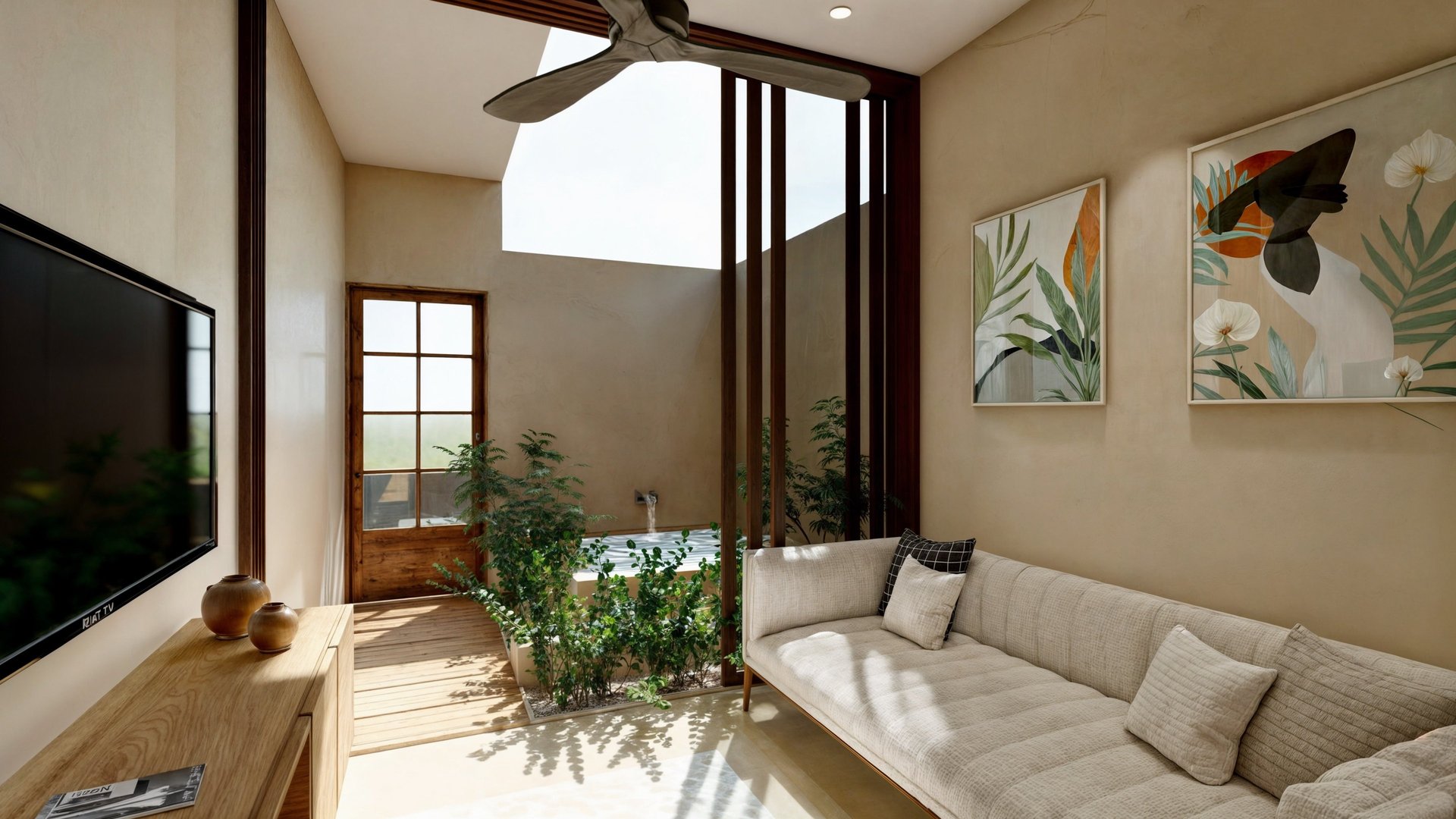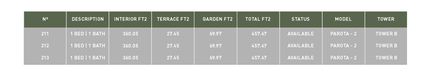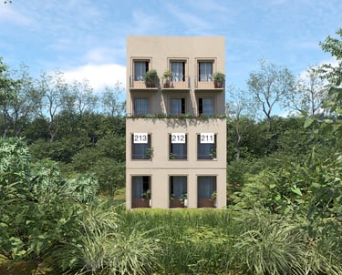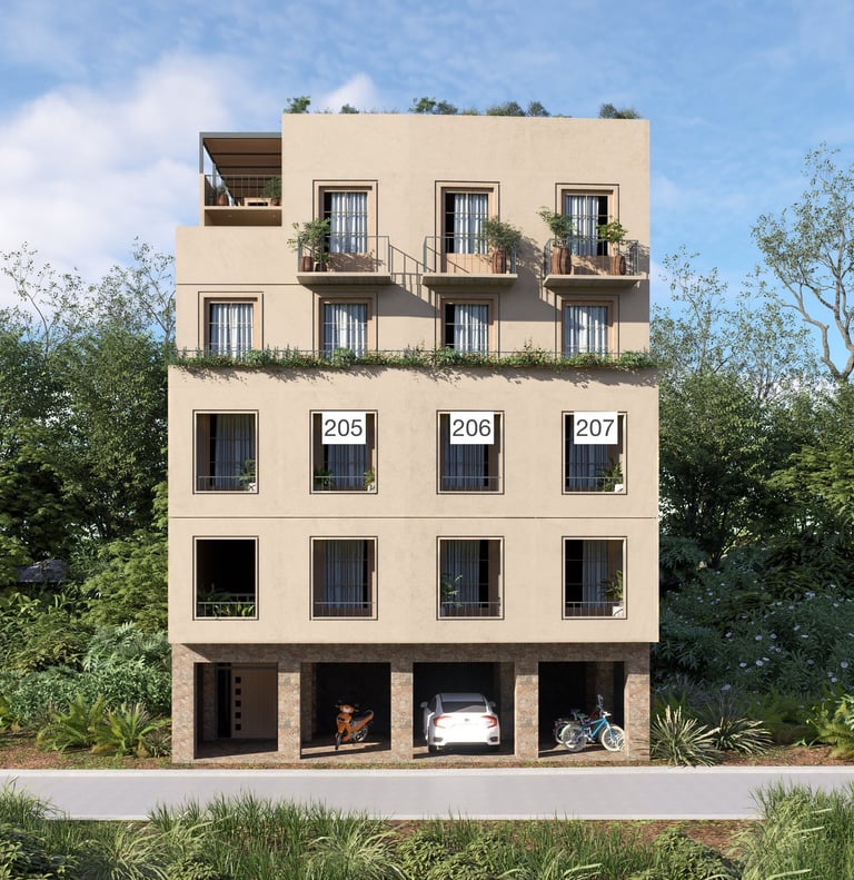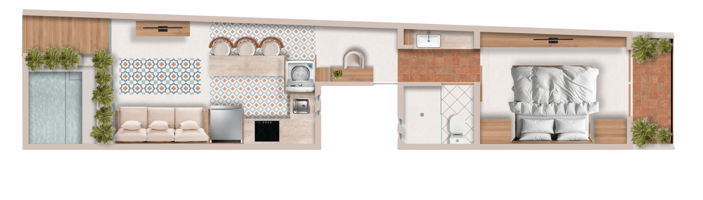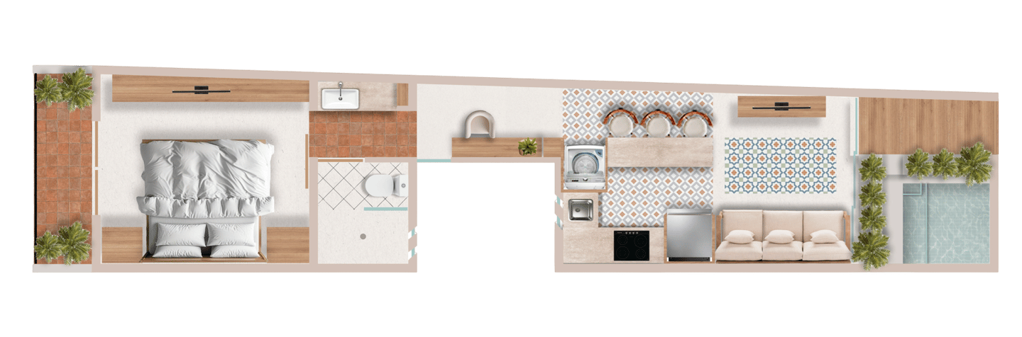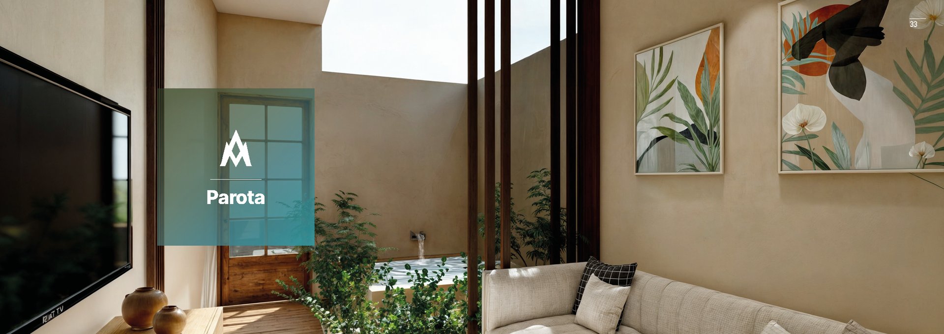 With six condominiums, Parota strikes the perfect balance between design and functionality. Each unit includes one bedroom, one full bathroom, a garden with a private pool, and a terrace. Unlike Macuil, the kitchen - dining room and living areas are integrated, creating an open space that encourages socializing in a fluid, contemporary setting.